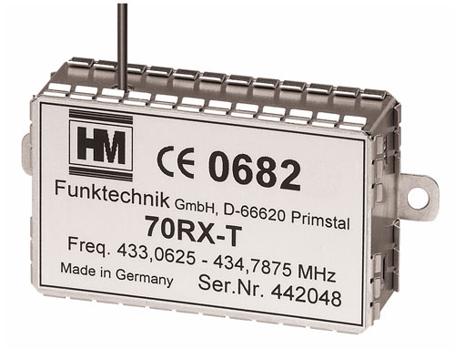 The new designed FM receiver module 70RX-T from HM-Funktechnik is an absolut high end module with internal synthesizer and microcontroller to convert the external 8 bit wide channel information into the serial data protocol for the synthesizer chip. No complicate programming is needed. The module offers 139 channels in the european 70cm ISM frequency range from 433.05 to 434,79 MHz and corresponds to EN 300086 demands.