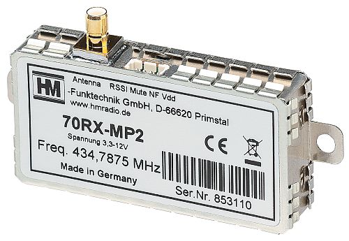 The 70RX-M2 is a high quality narrow band FM single channel radio receiver according to EN300220 and Part 15B with improved blocking behaviour. This significantly increases the immunity to interference from out-of-band interferers. In combination with our transmitter modules, radio systems with a very long range can be set up in simplex or half duplex operation.