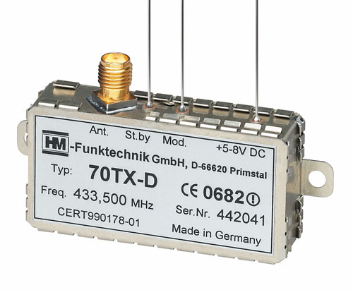 The UHF mini transmitter 70TX-D is one of the smallest crystal stabilized transmitter modules in the 500mW class. A wide voltage range and its low power consumption combined with the small size makes the module ideal for portable and mobile applications.